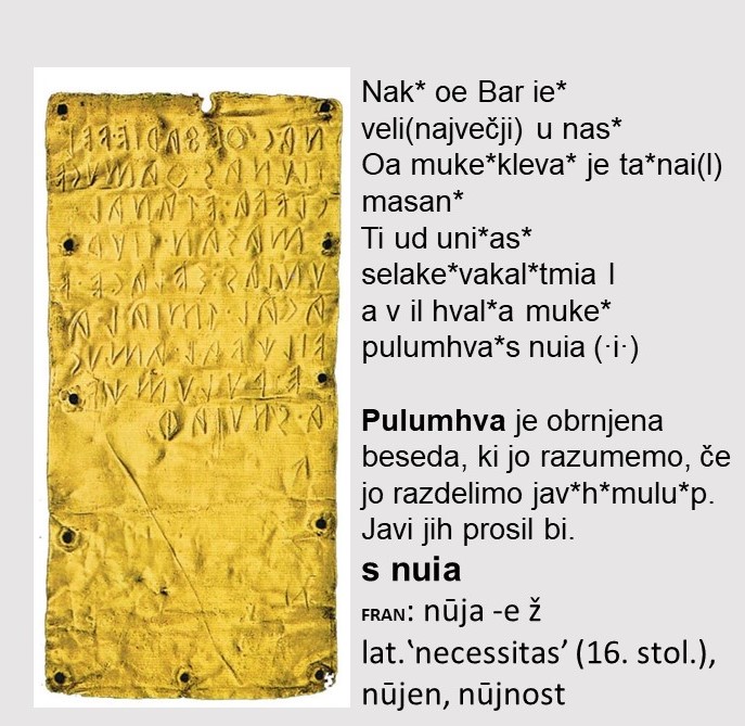 Leta 1964 so v kraju Pyrgi našli tri lističe od katerih dva lahko razumemo ob pravilnem črkovanju, če uporabimo rovtarščino torej slovenščino. Verjetna starost sega v III. stoletje pr. n.…