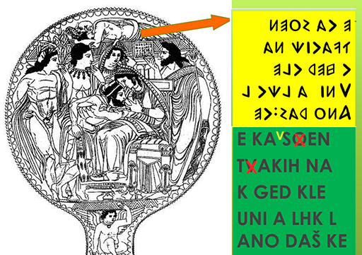Pri tej navedbi spoznamo števnik ano, ki je prepričljivo slovenska značilnost in zanika etruskologe o števnikih katere so izvajali iz Toskanske igralne kocke. V tej vrstici je izpričan tudi znak “š” (DAŠ,glagol dati) kar zopet potrjuje slovenščino kot vsebino, ki so jo zapisovali v antiki.