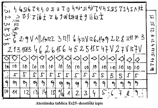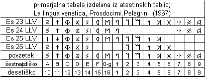 Ob utrjevanju in prepoznanju etruščanske abecede z razumevanjem besednih ter stavčnih pomenov, ko so napisi osrednje Italije spregovorili v obliki rovtarskega dialekta je bilo naravno in pričakovano opraviti tudi preizkus ‘venetskih’ znakov z matematičnim ključem. Najprej se je ponudila primerjava številk 1,2,3 in 9 z znanimi arabskimi številkami. V nadaljevanju skupne primerjave pa sem na atestinskih tablicah naletel na ponavljajoče razpredelnice s šestnajstimi razdelki. Znaki so se tudi na preostalih sedmih prostorih ponavljali. Tako je nastala ocena, da vsebino venetskih znakov predstavlja šestnajstiški številski sistem.