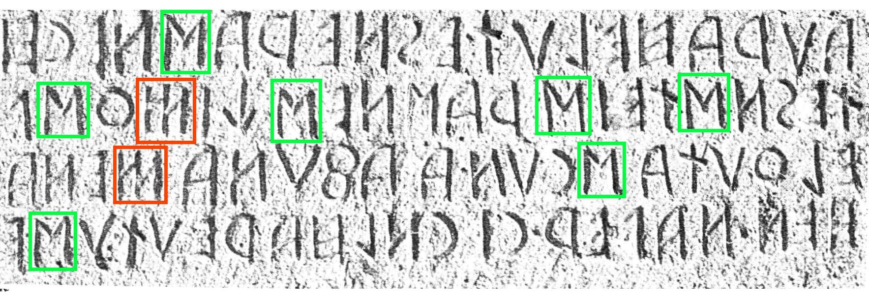 Z zelenimi šrafurami označeni znaki se v štirih vrsticah ponovijo 7x. Pisna znaka v rdeči šrafuri pa se ponovita samo dvakrat. Tu je torej izključena pisarjeva pomota. To zaporedje pa je povzročilo razmislek o drugačni vrednosti znakov. Znaka iz rdečih kvadratkov lahko najdemo na pirgijskih lističih. Vendar se tam uporabljajo samo tovrstni znaki, ki ob slovenskem odčitavanju vedno obdržijo glasovno vrednost “M”. Znaki iz zelenih kvadratkov se pojavljajo v enakih zaporedjih na atestinskih ploščicah v spodnji vrsti. Tam pa je ta vrednost izražena s številom 0/16 . Razumljivo je torej uporabiti te znake z odčitavanjem »nič« 0. Pravo vrednost tega znaka nam potrdi odčitavanje na cortonski tablici kjer tekst to znova primerno potrdi.